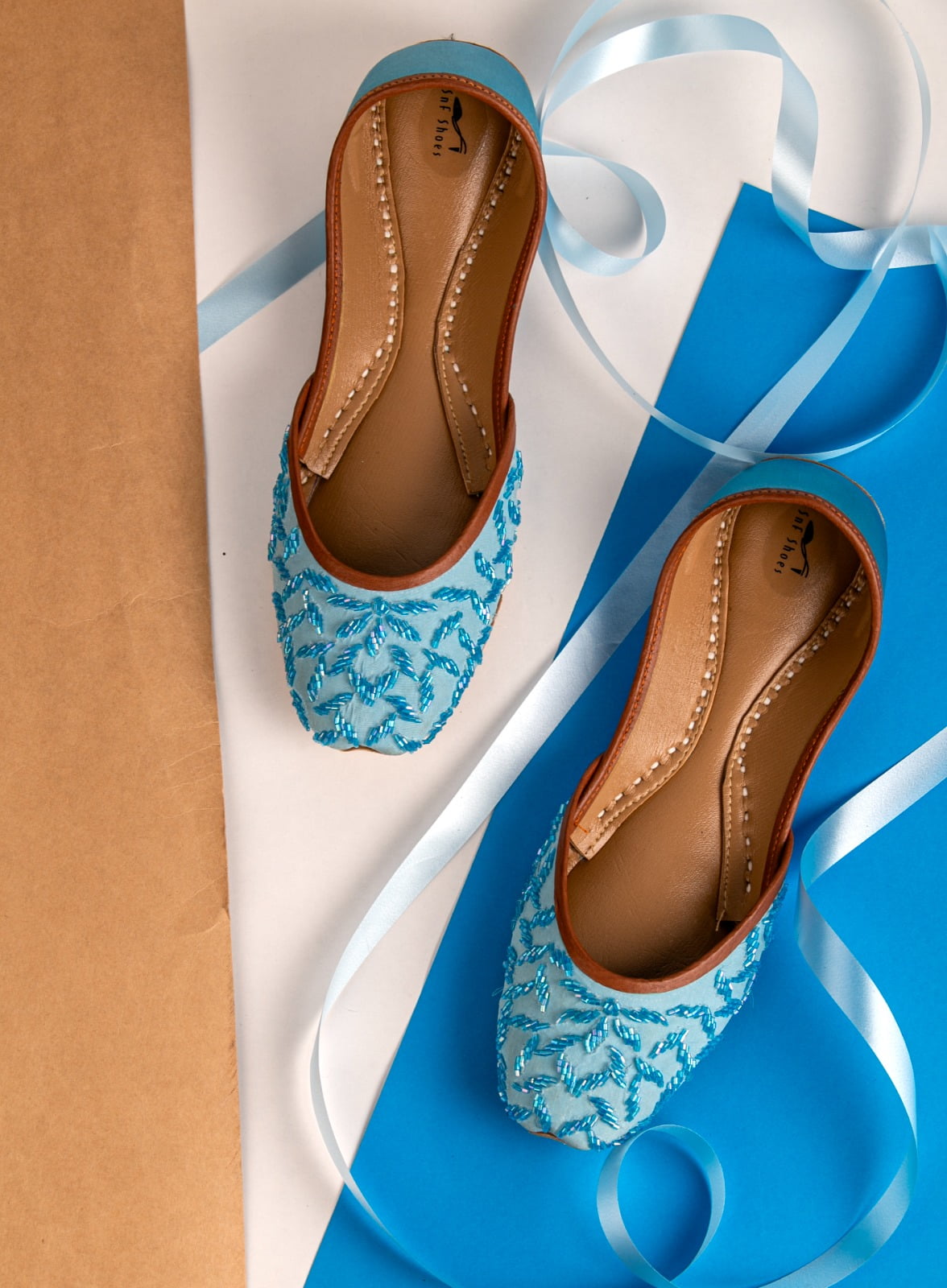 Looking for a way to add a pop of color to your wardrobe? These khussa are the perfect solution! The turquoise color is both trendy and timeless, and the festive design is sure to turn heads. The shoes are comfortable and versatile, making them perfect for everyday wear.Stand out from the crowd with these unique and stylish khussa. The turquoise color is sure to make a statement, while the festive design adds a touch of personality.