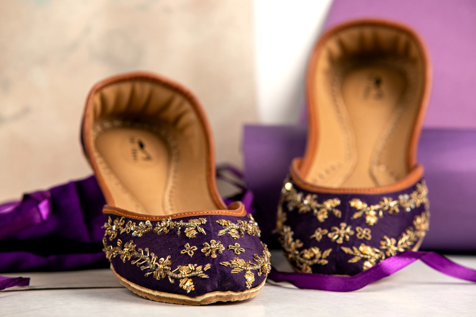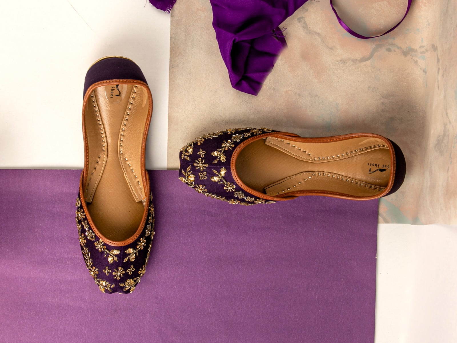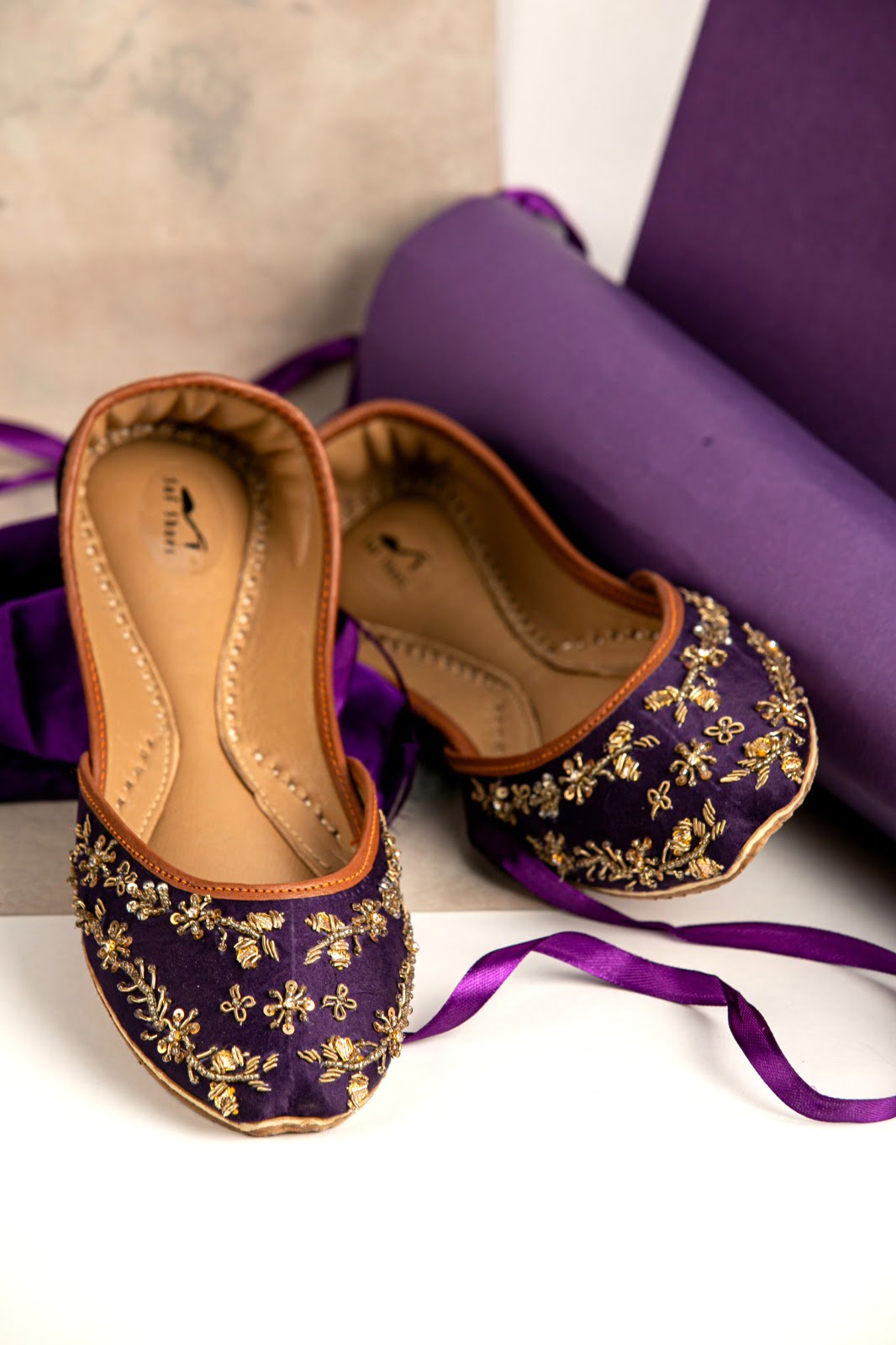 Step into a world of timeless elegance with these exquisite khussa, handcrafted from the finest materials. The intricate embroidery purple khussa with golden embridered. each stitch a testament to the artisan’s skill. As you slip them on, feel the luxurious comfort envelop your feet, and let the vibrant colors transport you to a land of enchantment.