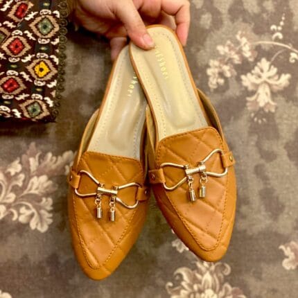 These stylish caramel-brown mules 🍂 offer a warm, versatile alternative to black, perfect for a refined daytime look. The rich tan hue beautifully complements the crisp white trousers, while the eye-catching gold chain detail 🔗 provides a touch of classic sophistication. With their easy slip-on style and chic squared toe, these pumps are ideal for adding a cozy yet polished flair to both casual and semi-formal ensembles. They are the epitome of effortless chic! ✨🥿